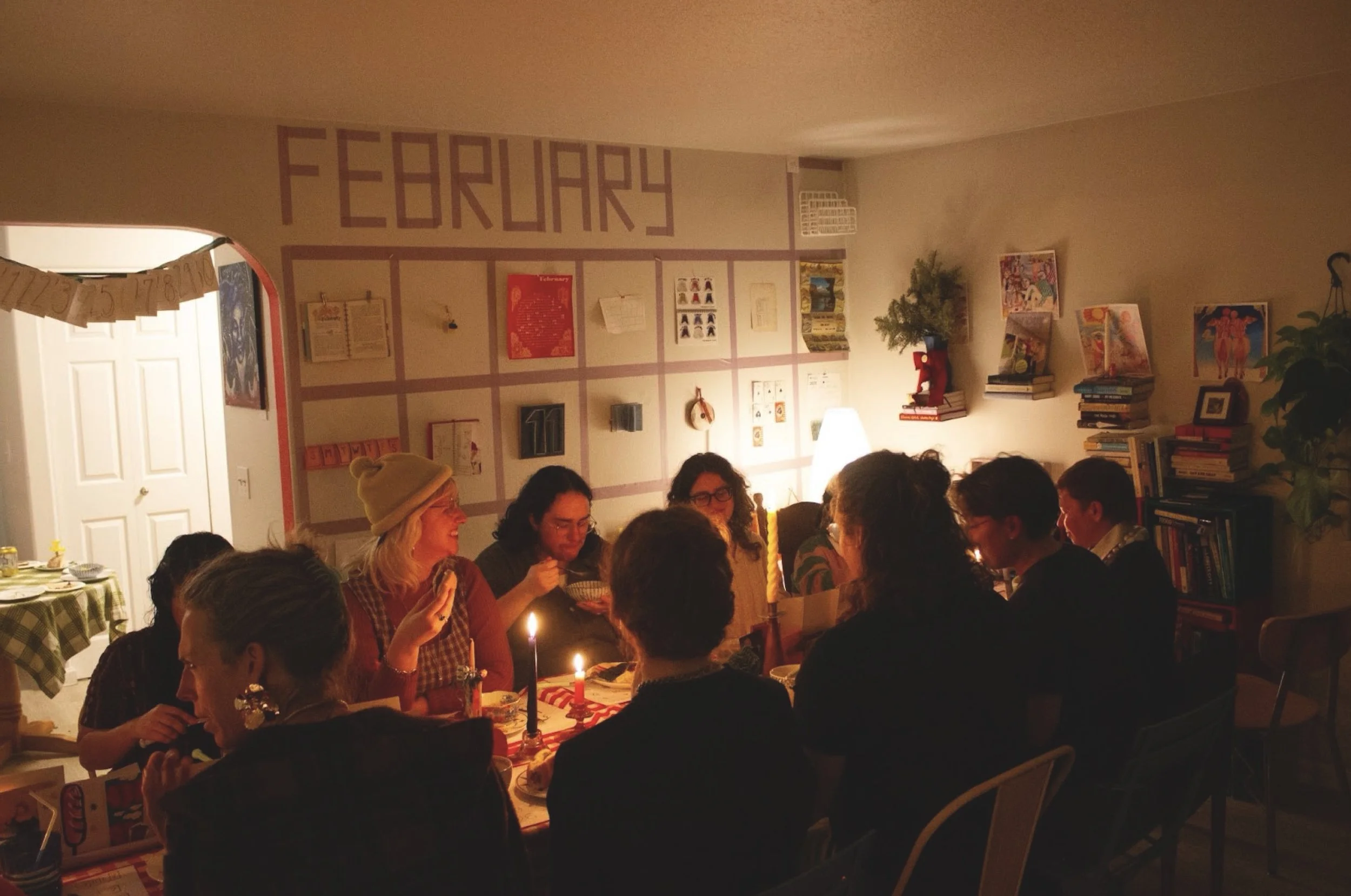 As part of our Artist in Residence at the Living Room gallery for the month of February, we turned the wall into a calendar where each day offered an unconventional calendar or time measuring tool. We activated the space by hosting Dinner of the Year, a dinner party where each guest was asked to bring a food that represented a designated month. Together we tasted the delights of a year in one sitting.